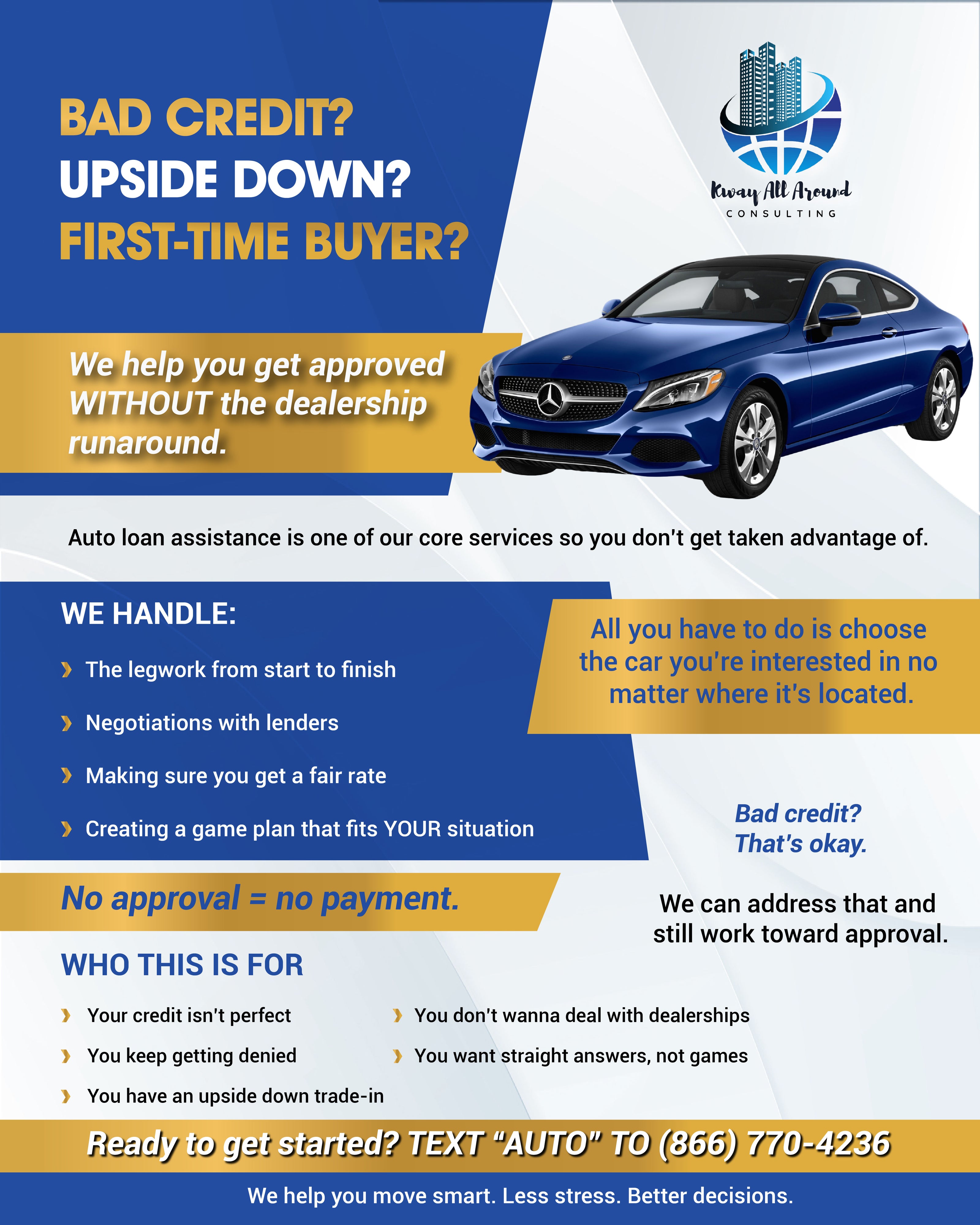 Our Auto Loan Assistance service is designed to help individuals navigate the car-buying process with clarity and confidence especially if you’ve faced credit challenges, prior denials, or feel overwhelmed by dealership negotiations.